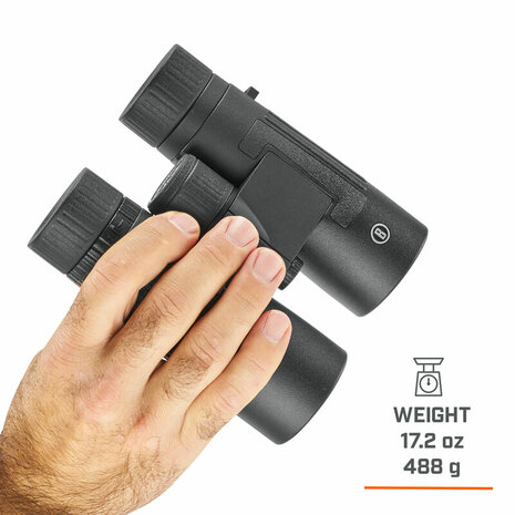 AGRESSIEVE TEXTUUR VOOR ZELFVERZEKERDE GRIP EN RUBBEREN BEHUIZING VOOR VALBESCHERMING Bijgewerkte ergonomie met zacht aanvoelend rubber en een textuur met gemakkelijke grip. Gemakkelijke griptextuur langs de zijkanten en de brug van de verrekijker vermindert de kans op vallen en geeft een zelfverzekerd gevoel in de hand, zelfs met één hand.
