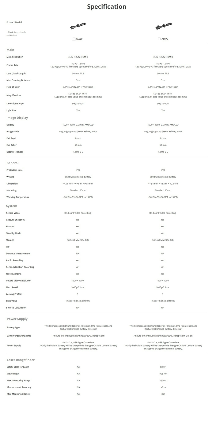 De ALPEX Pro A50PL beschikt over een 4512 × 2512 (12 megapixel) CMOS-sensor, goed voor ongeveer 45% meer pixels dan traditionele 4K digitale richtkijkers.