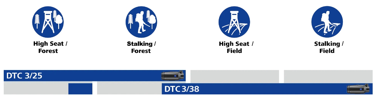 De ZEISS DTC 3/38 is uitermate geschikt voor het jagen in open terrein en op langere afstanden dankzij een detectiebereik tot 1950 meter en een gezichtsveld van 12,3 meter op 100 meter. Bij het jagen in bosgebieden of de bersjacht zorgt de ZEISS DTC 3/25 met een gezichtsveld van 18,4 op 100 meter voor een perfect overzicht op korte afstanden en een uitstekende herkenning van details. De ZEISS DTC 3/25 is de perfecte keuze voor situaties waarin men snel moet reageren.