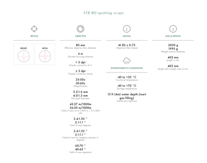 Dankzij de kristalheldere HD-optiek en de objectiefdiameter van 80 mm biedt de STR 80 spotting scope een indrukwekkende detailherkenning en heldere, levensechte beelden, zelfs bij slechte lichtomstandigheden. Het in- en uitschakelbare dradenkruis van de STR 80 spotting scope maakt het mogelijk om comfortabel te wisselen tussen het nauwkeurig inschatten van afstanden en ononderbroken kijken. Het is ook perfect voor het documenteren van gebeurtenissen tijdens digiscoping. De krachtige HD-optiek met fluoridehoudende lenzen en het dradenkruis met MRAD-impactpuntcorrectie vormen het perfecte totaalpakket voor nauwkeurig observeren.