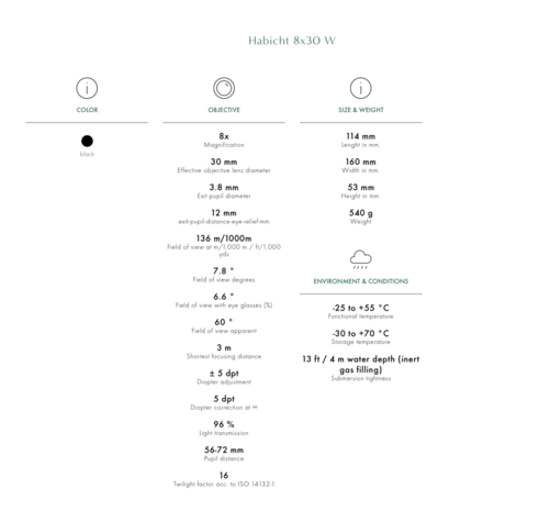 Het compacte, lichte Habicht 8x30 model, met een gewicht van slechts 540 g, is een zwart gepantserde verrekijker met porroprisma. Deze verrekijker, die al vele jaren beproefd en getest is, biedt een uitstekend gezichtsveld van 408 ft / 136 m, zelfs met zijn traditionele ontwerp.