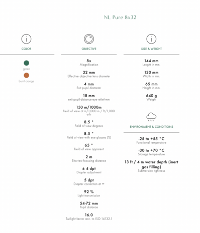 Met een vergroting van 8x brengt de NL Pure 32 u dichter bij de actie, terwijl een gezichtsveld van 150 m (492 ft) te allen tijde een perfect overzicht garandeert.